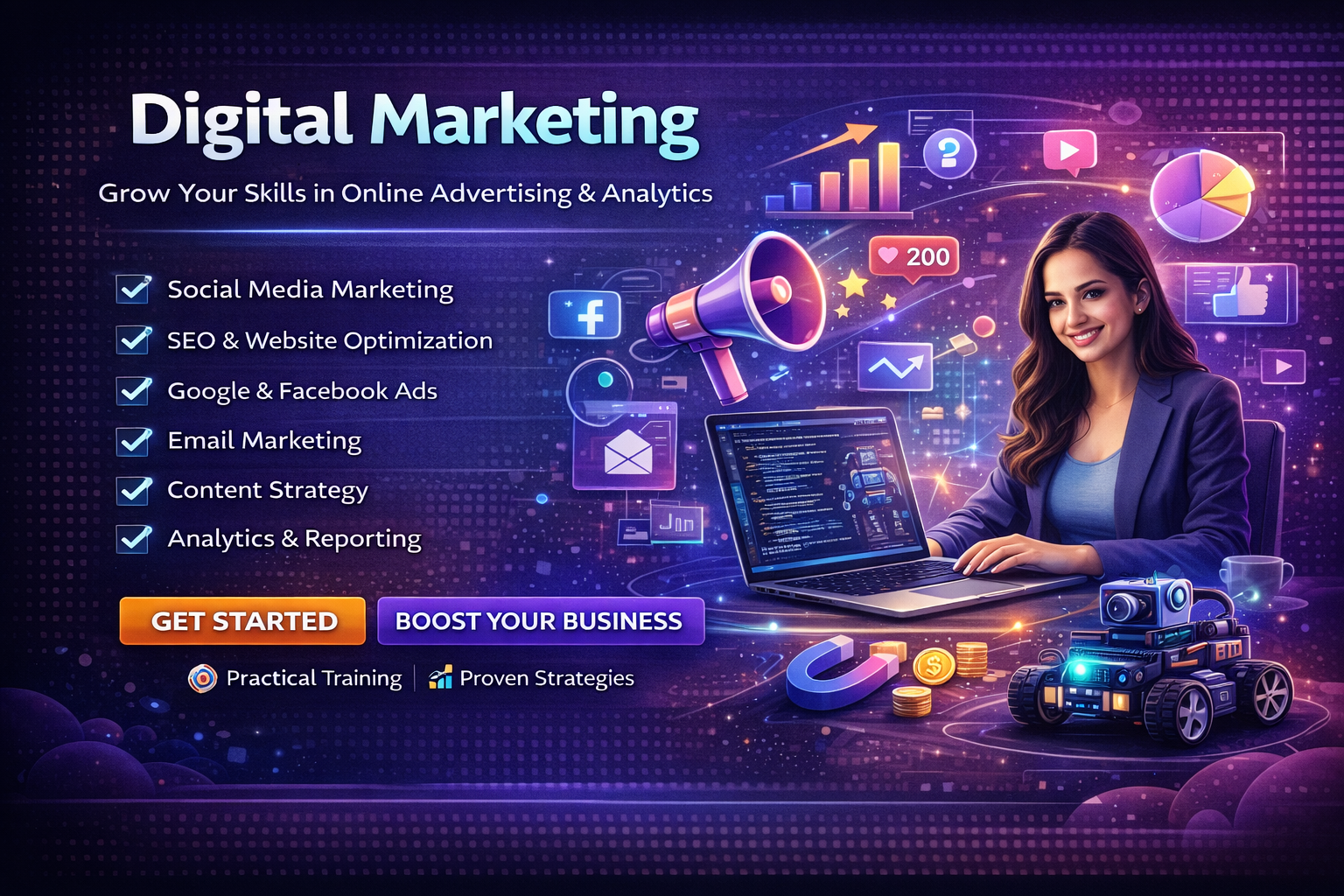 Digital Marketing – Learn modern online marketing strategies to grow brands using social media, SEO, content, and analytics.