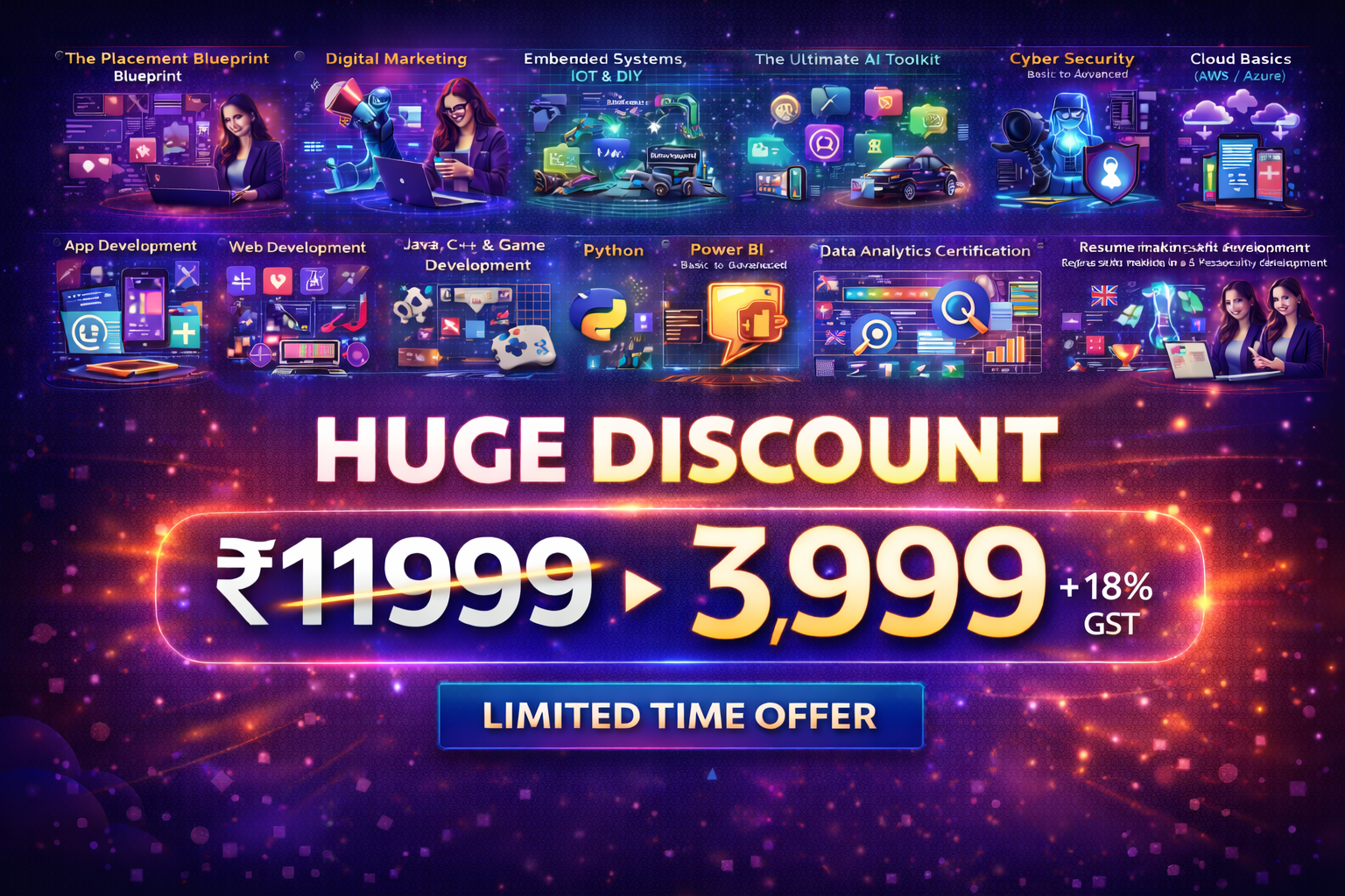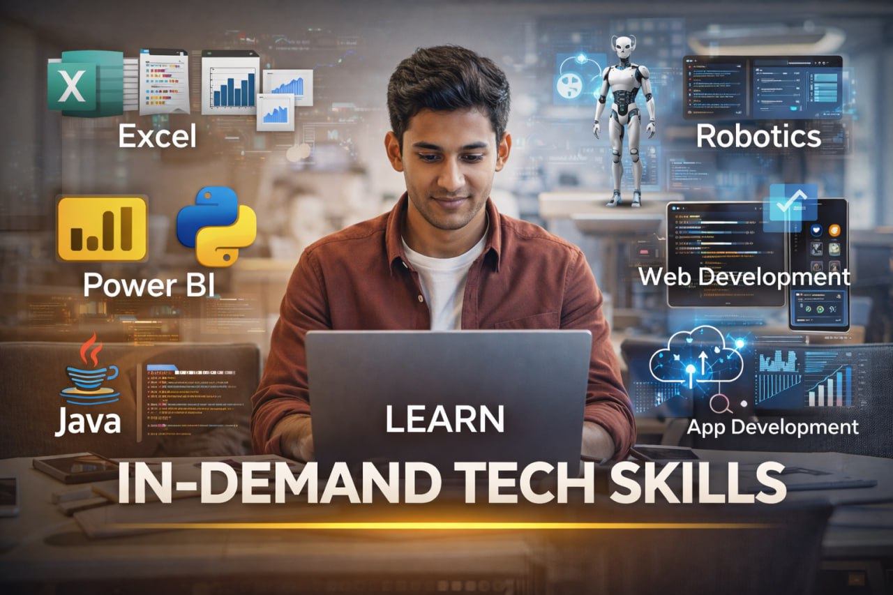 The Placement Blueprint – Complete placement preparation with skills, strategy, and confidence. Digital Marketing – Grow brands online using SEO, social media, ads, and analytics. Robotic Science – Learn robotics fundamentals, sensors, control, and automation. Embedded Systems, IoT & DIY – Build smart hardware systems and IoT-based DIY projects. The Ultimate AI Toolkit – Use powerful AI tools for productivity, automation, and innovation. Cyber Security (Basic to Advanced) – Protect systems and data from modern cyber threats. Cloud Basics (AWS / Azure) – Understand cloud computing concepts and core services. App Development – Create functional and user-friendly mobile applications. Web Development – Design and develop responsive, dynamic websites. Java – Build secure, scalable, platform-independent applications. C++ & Game Development – Develop high-performance programs and interactive games. Python – Learn versatile programming for automation, data, and AI. Power BI (Basic to Advanced) – Create interactive dashboards and data visualizations. Data Analytics Certification – Analyze data to generate insights and support decisions. Advanced Canva Designing – Design professional creatives using Canva tools. Excel Course (Basic to Advanced) – Master spreadsheets for analysis, reporting, and automation. Resume Making & Personality Development – Build professional resumes and career confidence. Communication Skill Development (English & French) – Improve professional communication and language skills. Soft Skills & Personality Development – Develop workplace-ready behavior and interpersonal skills.