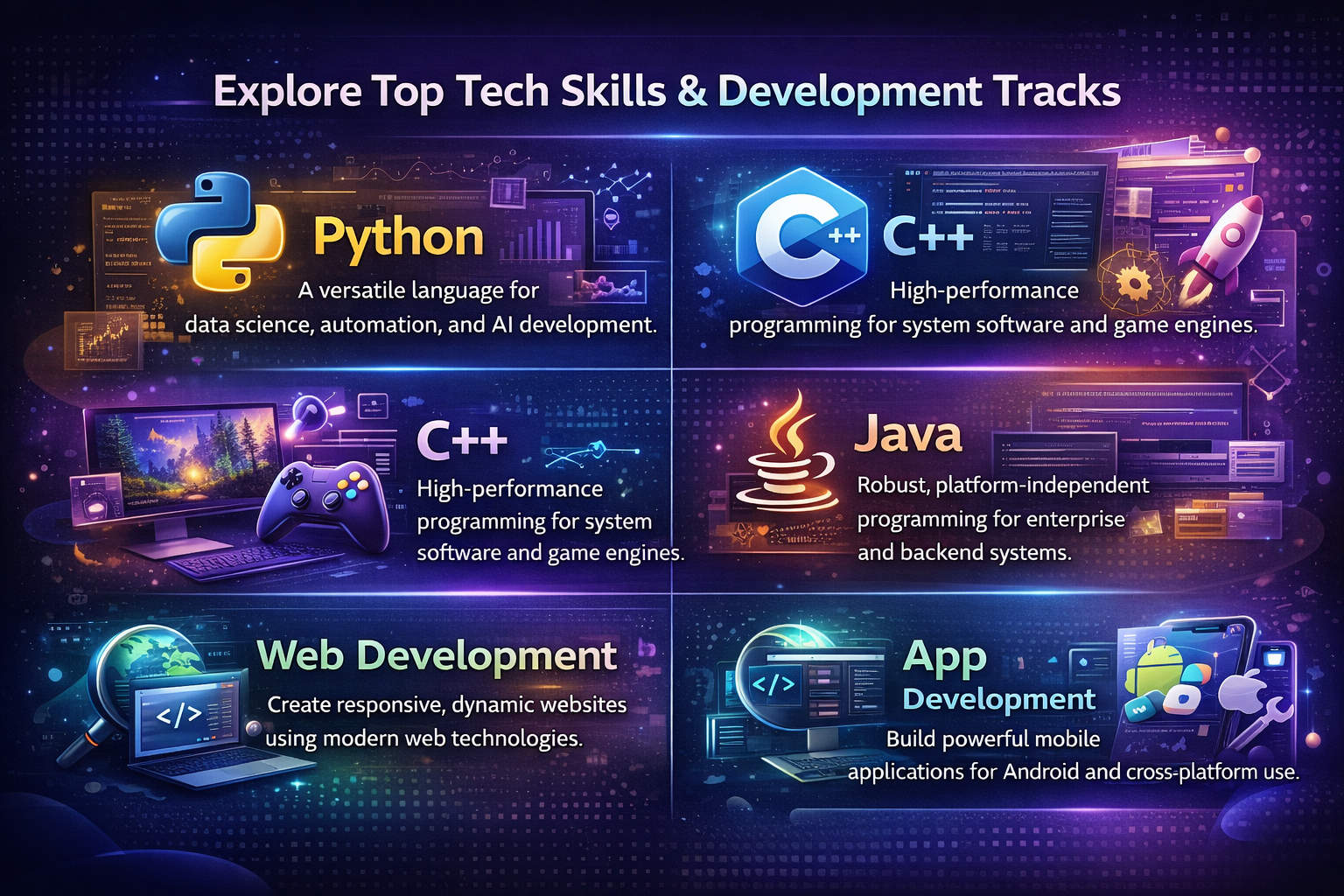 Python – A versatile language for data science, automation, and AI development. C++ – High-performance programming for system software and game engines. Game Development – Design and build interactive games using modern tools and engines. Java – Robust, platform-independent programming for enterprise and backend systems. Web Development – Create responsive, dynamic websites using modern web technologies. App Development – Build powerful mobile applications for Android and cross-platform use.